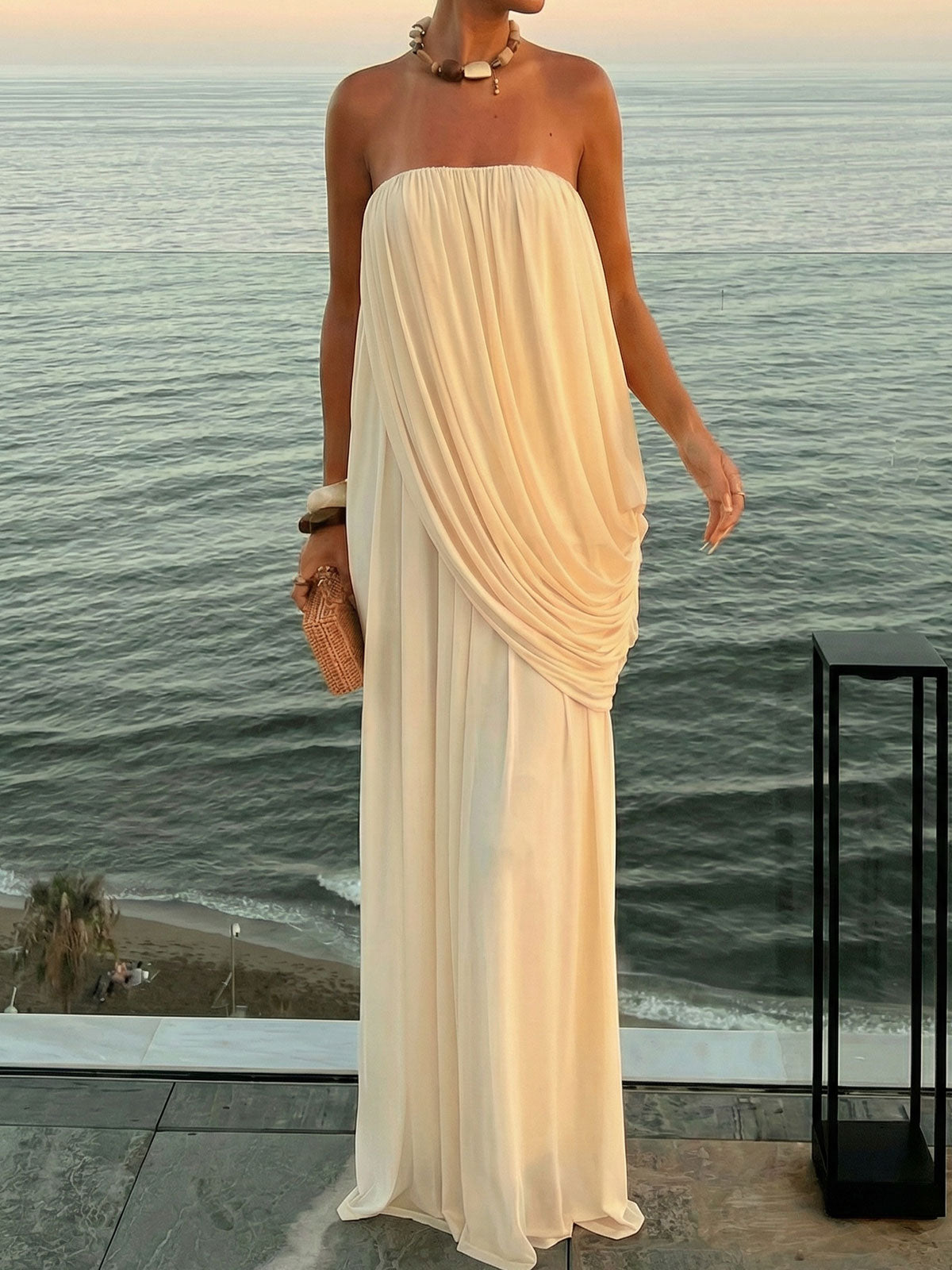 Goddess Tube Top Gerimpeld Draped Chiffon Resort Strapless Maxi Jurk