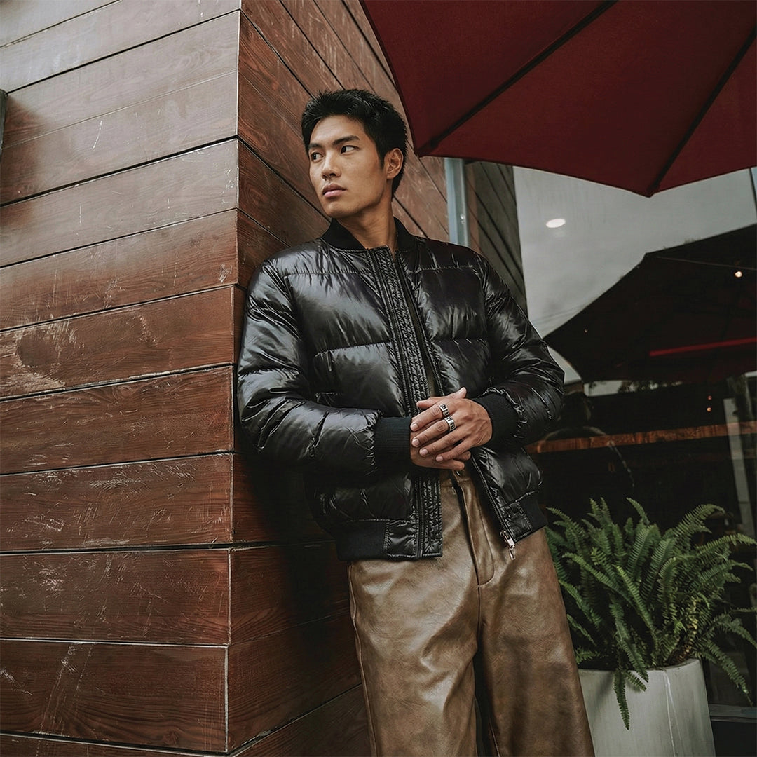 Insulated interior for warmth and comfort, two-way front zip for versatile styling, and a ribbed knit baseball collar for a timeless finish. Made from nylon, polyester & silk-like cotton.